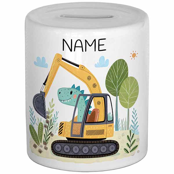 Zusammenfassung: Dieses Produkt ist eine personalisierbare Keramik-Spardose für Kinder (9,5 cm hoch, 8 cm Durchmesser) mit Gummiverschluss. Sie ist als Geschenk zur Geburt oder Taufe gedacht. Kunden können einen Namen und eines von 10 Motiven im Skandi/Retro-Stil wählen (Tiere wie Dinos oder Löwen, die Fahrzeuge wie Bagger oder Traktoren fahren).