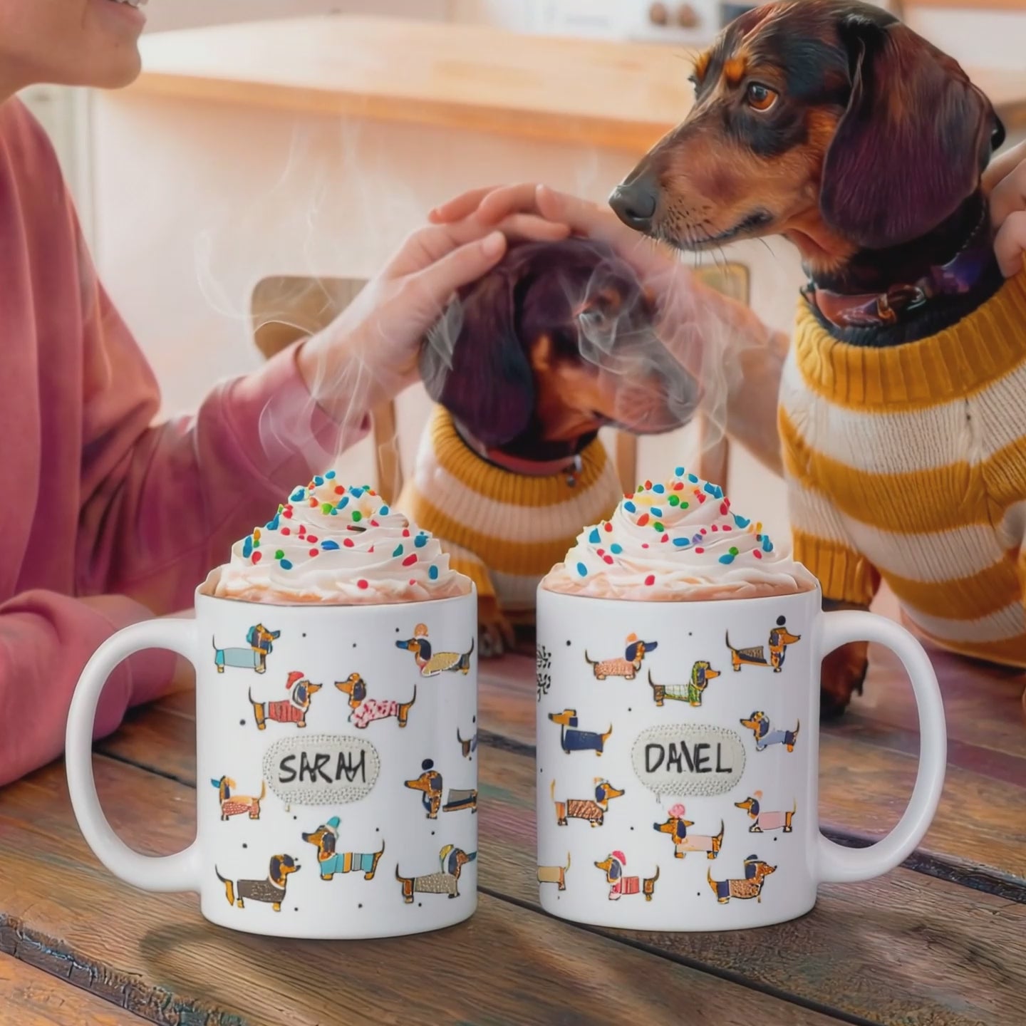 Antwort: Ja, wir gestalten das Design so, dass es ein harmonischer Rundumdruck ist. Egal wie du die Tasse hältst (Links- oder Rechtshänder), der Name und die Dackel sind zu sehen.